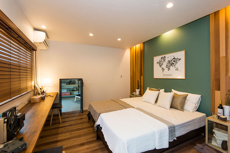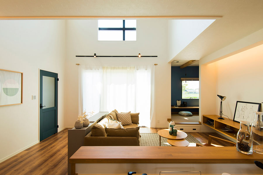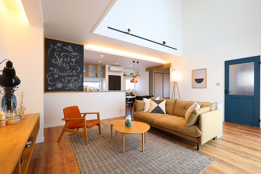 深いグリーンのリビングドアは、ウッドワン社のピノアースオーダーペイントを使用。空間に程よいアクセントを添えながらも、無垢ならではの魅力にあふれています!男前なインダストリアルな雰囲気をベースに、優しいナチュラルデザインを融合させたMIXスタイルの家。