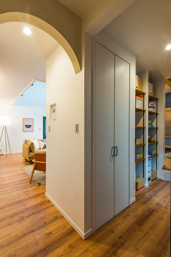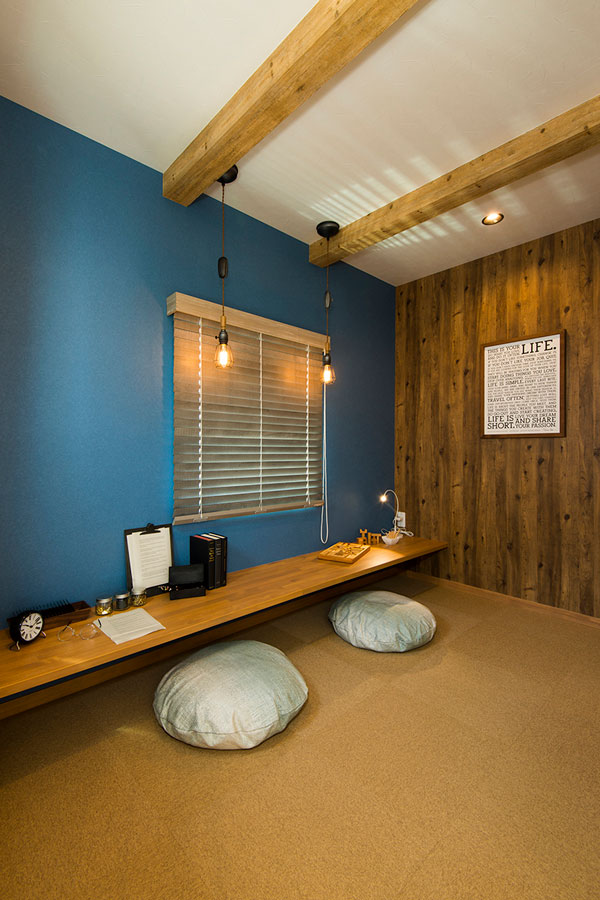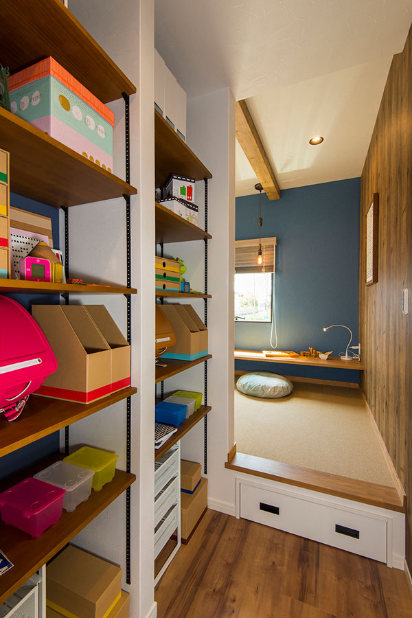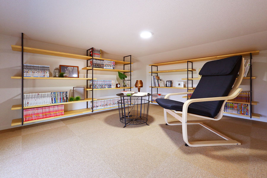 隠れ家のような雰囲気の小屋裏を活用した書斎&収納。 いつも家族のために頑張るパパやママにも、たまにはゆっくり一人の時間を!大好きな本に囲まれて、時間が経つのも忘れてしまいそうなほど、快適な空間になりました。