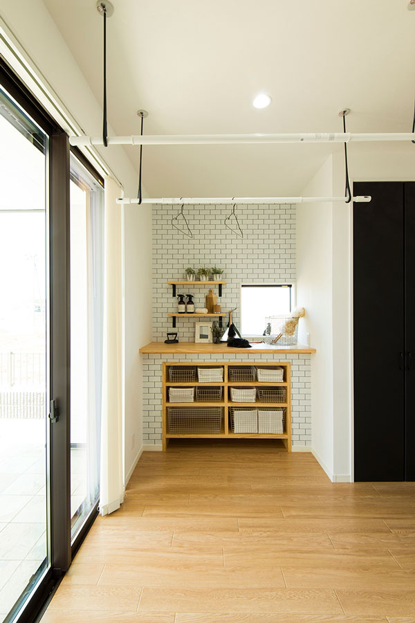 1年を通して季節・天候に左右されずに、洗濯物が干せる専用の部屋を作りました!干す・たたむ・しまうはもちろん、カウンターを設けているので、アイロンもお裁縫もできちゃう♪さらにそのままテラスに出られるので、重たい洗濯物2階に持っていく手間もありません。