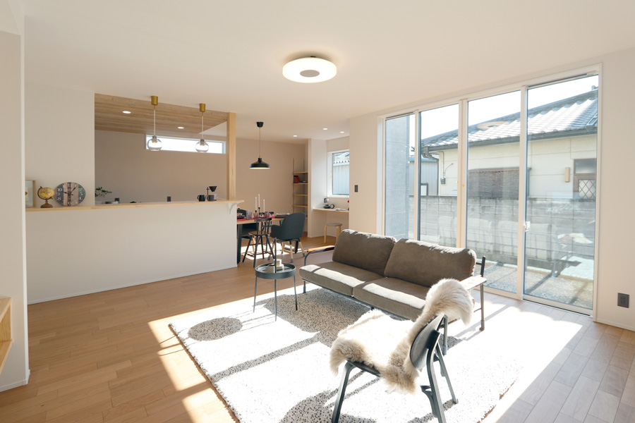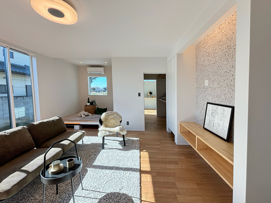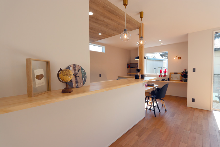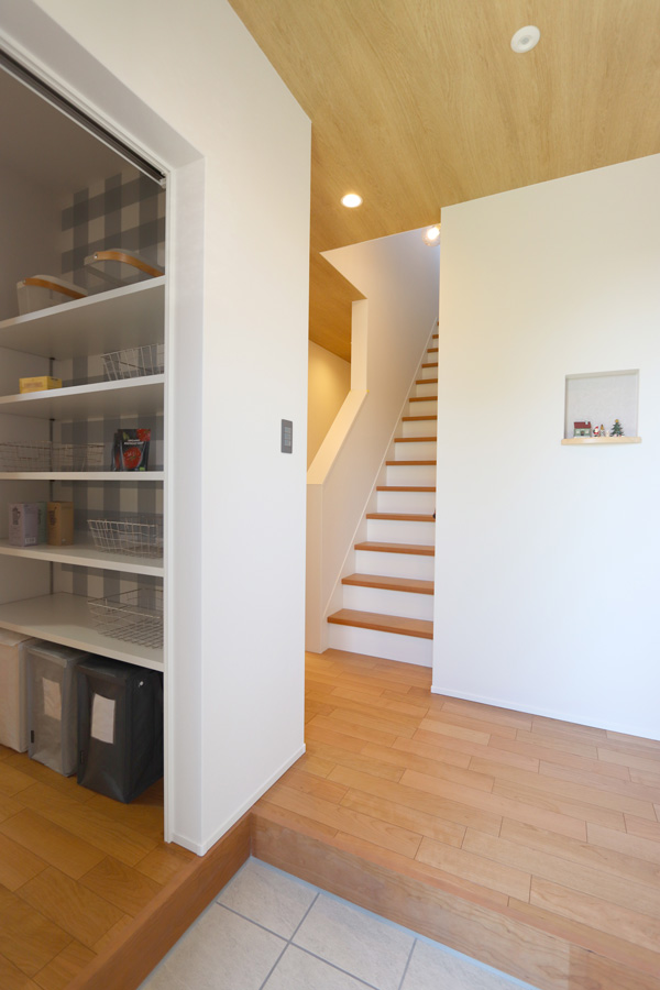 玄関からパントリーを通ってキッチンまで1歩で行ける。ラク家事メソッドで時短が叶う家 2階建て パントリー ファミクロ 畳スペース ランドリースペース タイルデッキ 1F床面積:76.59㎡(23.17坪) 2F床面積:49.27㎡(14.90坪) 延床面積:125.86㎡(38.07坪) BELS認定を取得した「ゼロエネルギー住宅(ZEH)」省エネ性能に優れた住宅です!