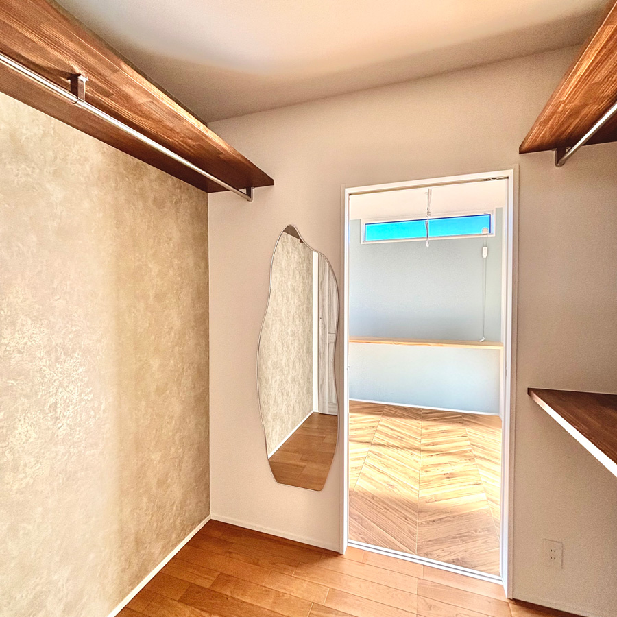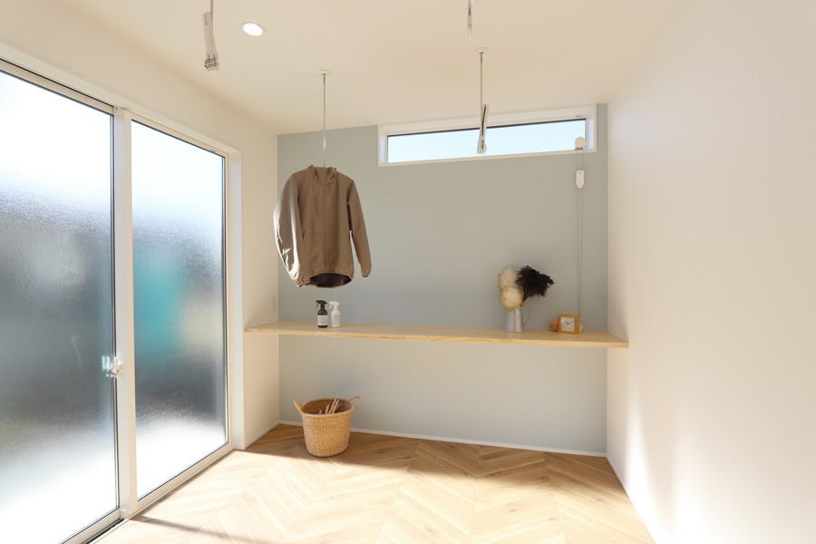 〖バルコニー不要〗共働き世帯に人気のお部屋No.1のランドリールーム‼ 「洗う→干す→たたむ→隣のWICへ」最短距離で完結。 ランドリーからもリビングからもアクセスできるウォークスルー型ファミリークローゼット。子どもが自分でできるようにパイプは大人用と子供用の2段に。