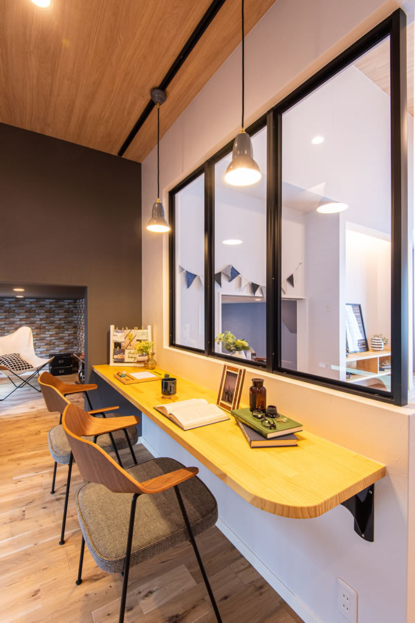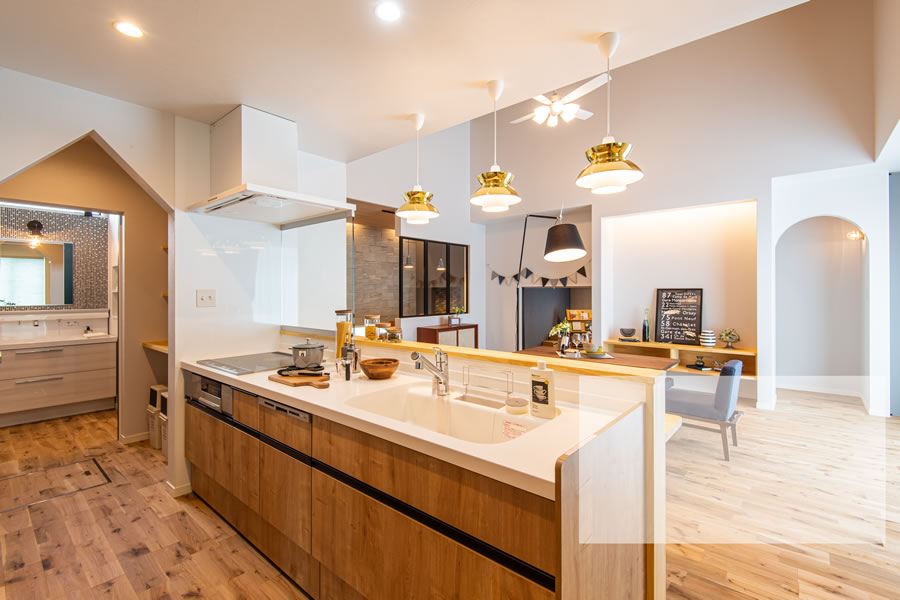 家の中心にあるキッチンはグルグル回れる回遊動線。料理をしながらでも子供たちの遊んでいる姿が見渡せるので安心!リビングの隣には、家族の気配が感じられる半個室のワークスペースを♪子供たちが勉強したり。パパママのテレワークに使ったりと、家族みんなが使えるスペースです!