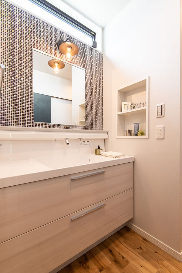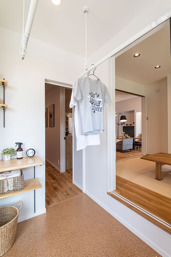 天候や時間を気にしないで、自分たちのリズムで気兼ねなく洗濯物が干せるランドリールーム。乾いた洗濯物は隣の和室でゆっくりたためます!